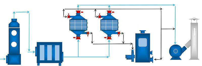 (2)完成解吸脫附以后活性炭吸附器Ⅰ進入待用狀態(tài),待活性炭吸附器Ⅱ接近飽和時,系統(tǒng)再自動切換回來,同時對活性炭吸附器 Ⅱ進行解吸脫附,如此循環(huán)工作。